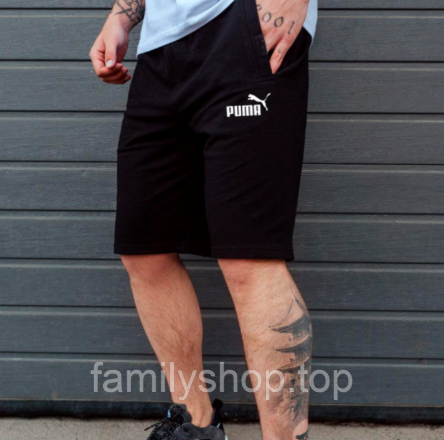 Стильні однотонні чоловічі шорти виготовлені з якісного турецького матеріалу — трикотаж двонитка. Чоловічі чорні спортивні шорти Пума вільного крою, довжина до колін. Зручні чоловічі літні шорти ідеально підходять для бігу та спортзалу, активного відпочинку або для дому.